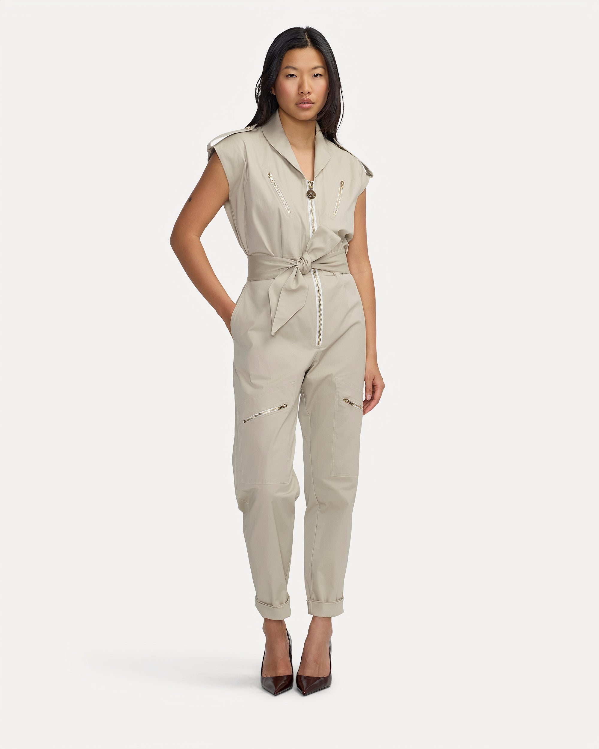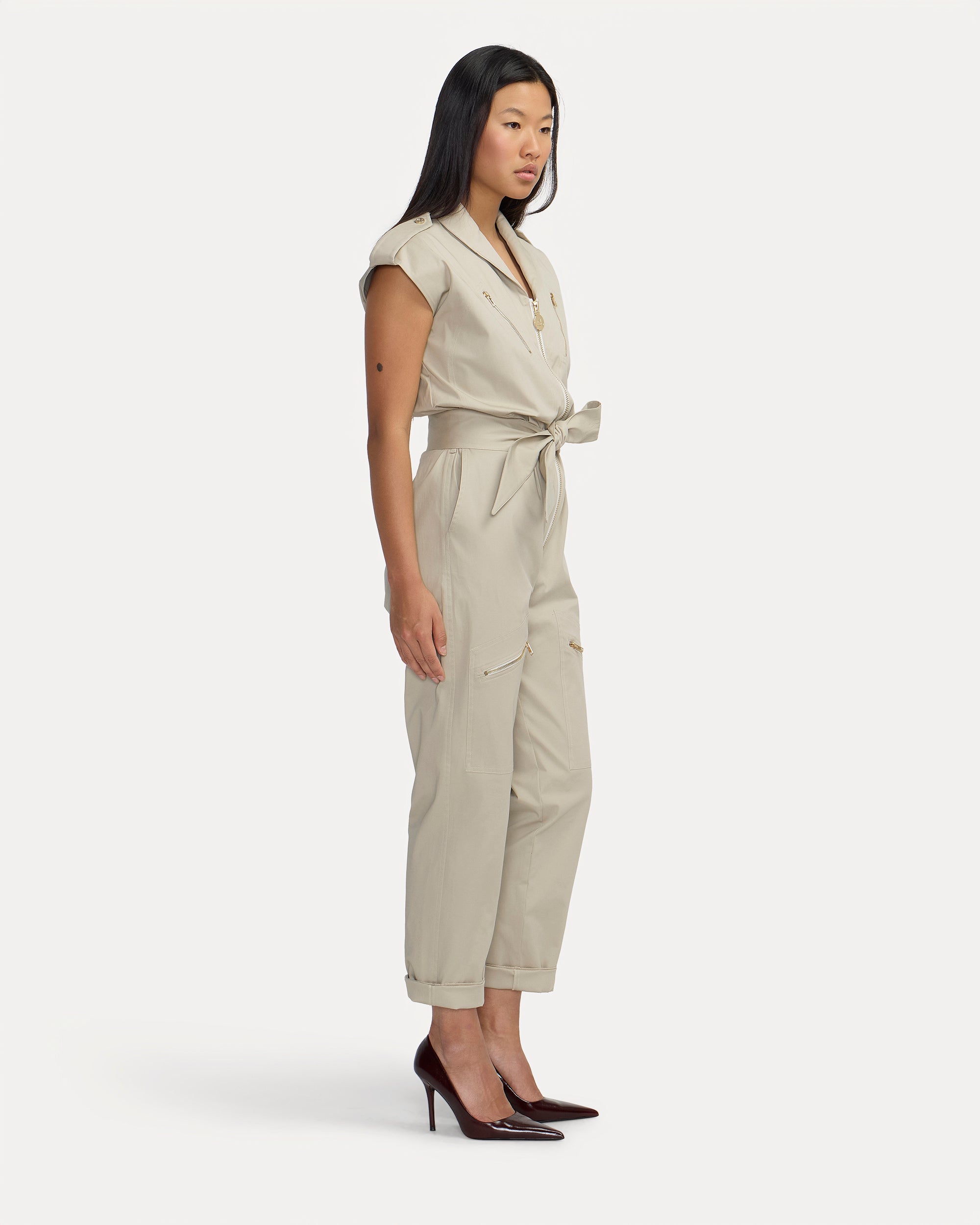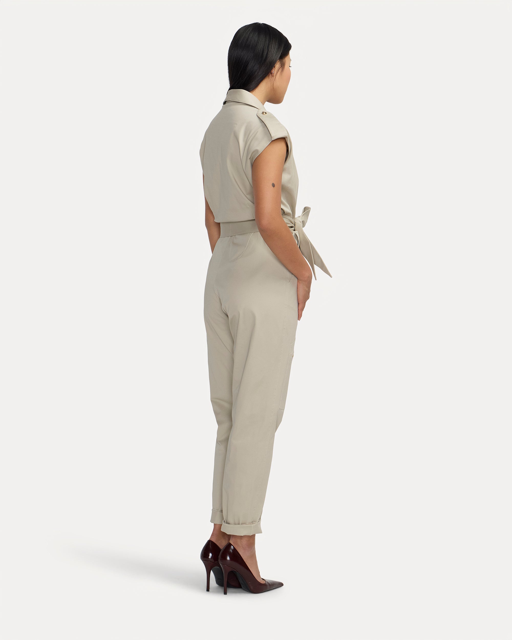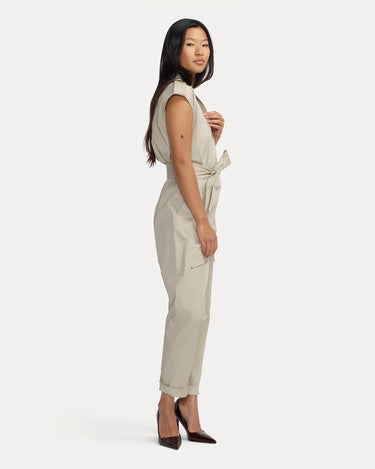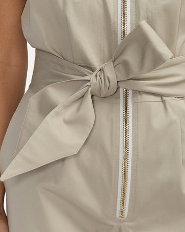 La combinaison Bathilde se décline dans un beige lumineux à l’élégance naturelle. Sa coupe structurée sans manches, soulignée par une ceinture à nouer ton sur ton, met en valeur la silhouette.