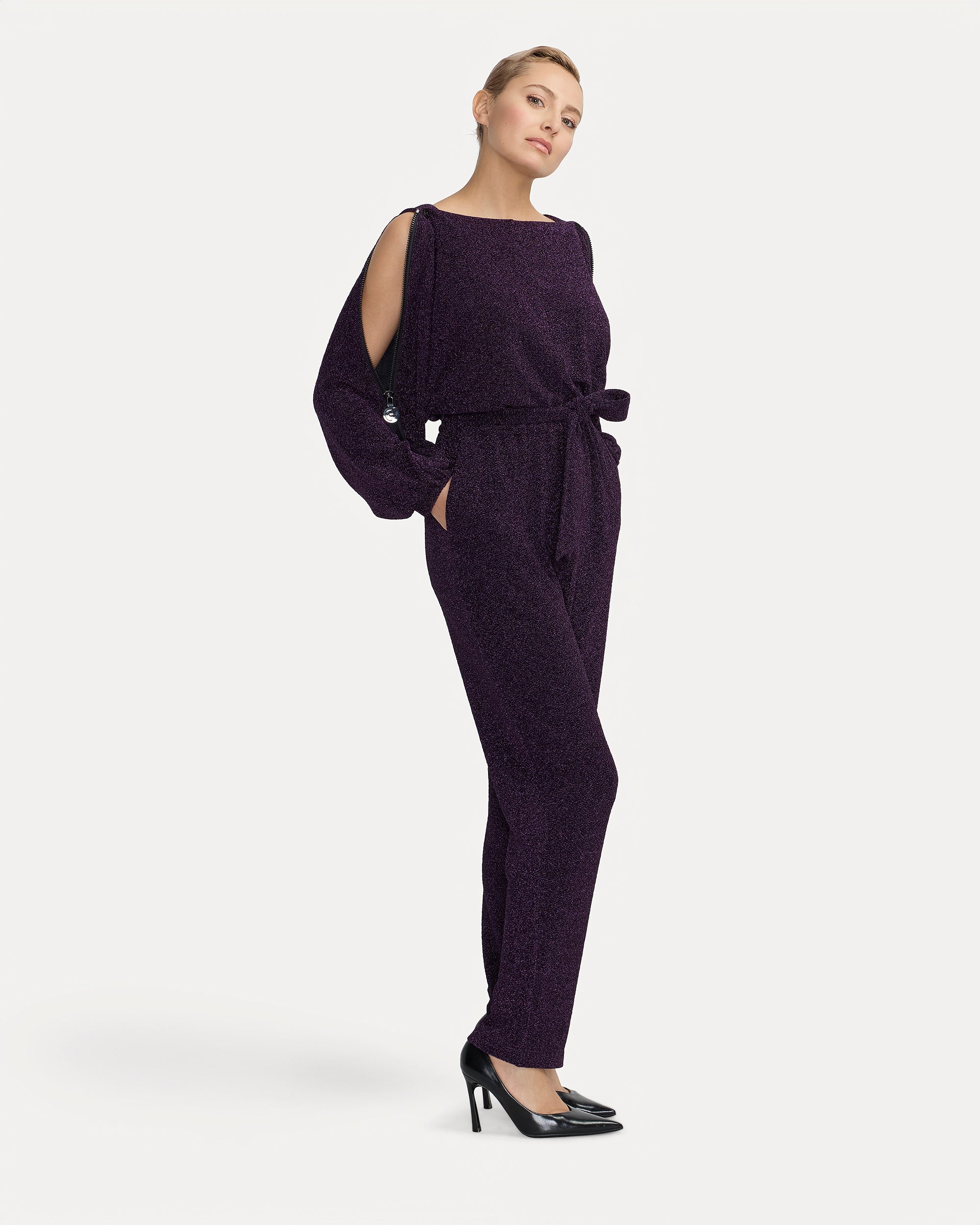 Idéale pour les occasions festives, la combinaison Carole violette scintillante allie raffinement et modernité. Son col bateau met en valeur le port de tête, tandis que ses manches ouvertes zippées ajoutent une touche contemporaine et audacieuse. Avec son tissu lumineux et sa coupe fluide, elle offre un parfait équilibre entre élégance et confort.